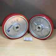 Branded R & K https://www.rkwheels.com/products/loadmaster-polyurethane-wheels They are POSSIBLY for battery powered and electrical powered automatic floor scrubbers, such as the Advance Convertamatic 200E electrically powered floor scrubber drier.